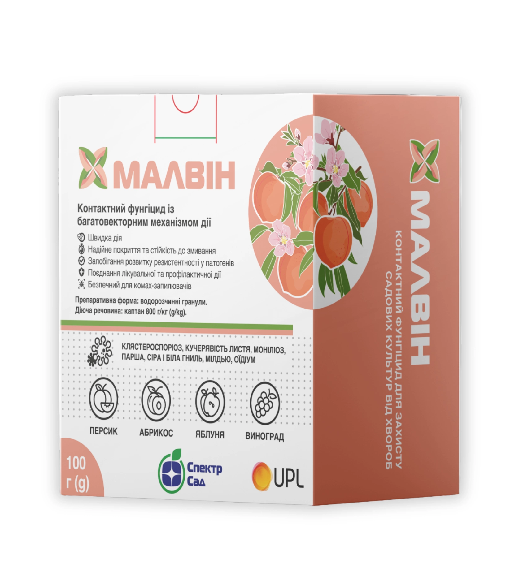Малвин — контактный фунгицид с многовекторным механизмом действия, предназначенный для защиты плодовых культур и виноградников от комплекса наиболее распространённых грибковых заболеваний. Препарат содержит каптан и обеспечивает надёжное защитное покрытие поверхности растений.