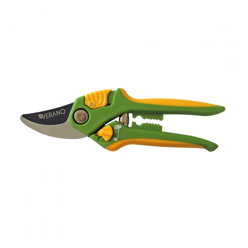 Довжина секатора 205 мм. Верхнє лезо - високовуглецева сталь SK-5, покриття "проти налипання" з Політетрафторетилену (PTFE). Нижнє лезо - середньовуглецева сталь S50C, хромоване. Косий різ. Максимальний діаметр різу в режимі великої руки до 19 мм. У режимі маленької руки до 10 мм. Верхній зсувний пластиковий механізм фіксації лез. Прапорець для регулювання розкриття лез та рукояток. Стрічкова пружина. Рукоятки з PP+TPR.