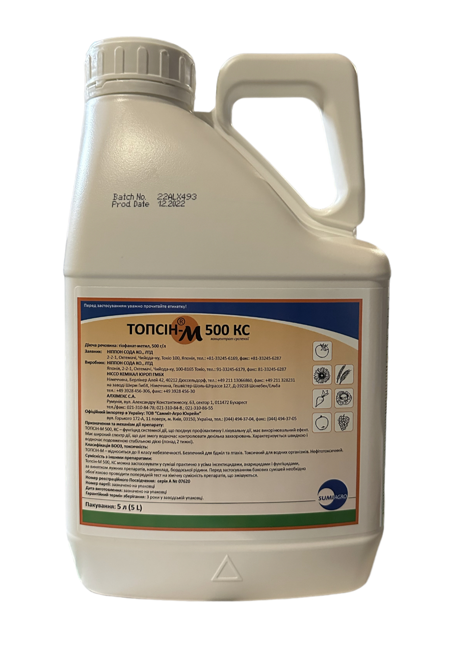 Фунгіцид Топсин-М 500 к.с - високоефективний фунгіцид, застосовується на овочевих та плодово-ягідних культурах з метою лікування та профілактики широкого спектру грибкових захворювань. Препарат проникає в рослини і зупиняє зростання патогенних спор грибів, захищає від повторного зараження протягом 30 днів, а також не завдає шкоди оброблюваним культурам і не накопичується в них.