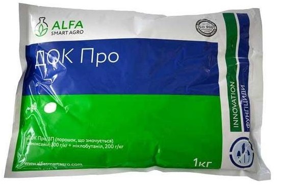 Действующие вещества фунгицида ДОК Про - цимоксанил и миклобутанил - относятся к разным химическим классам, быстро адсорбируются тканями и распространяются по всему растению. Цимоксанил влияет на синтез нуклеиновых кислот, белков, жиров, дыхание мицелия и проникновение мембран в клетках патогена, что обеспечивает надежное подавление возбудителя и предупреждает проявление резистентности. Действующее вещество имеет эффект капсулирования инфицированных клеток, останавливает развитие и распространение заболевания. Миклобутанил блокирует биосинтез эргостерина, входящего в состав клеточной стенки мембраны гриба, что приводит к нарушениям в процессе деления клеток, а впоследствии - и к гибели патогена.