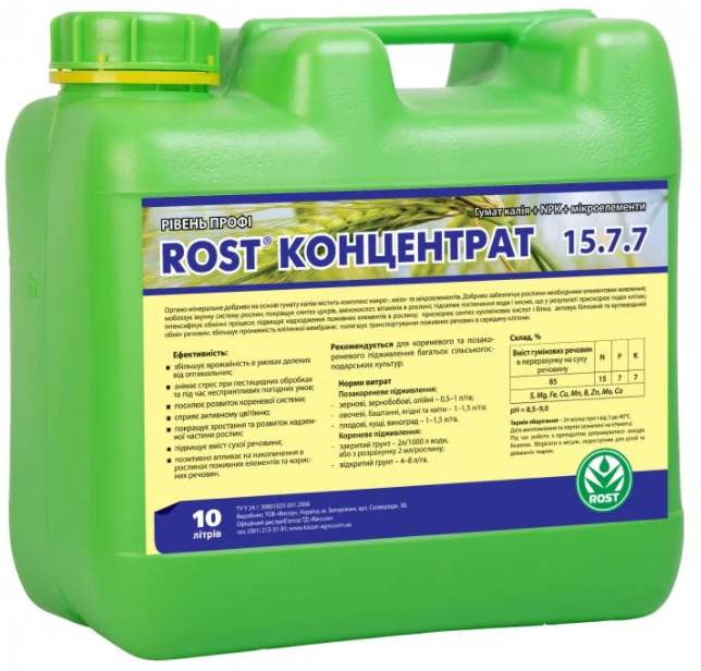 "ROST-концентрат" - удобрение со стимулирующим эффектом и фунгицидной активностью, является продуктом переработки натурального торфа, из которого изъяты активные вещества. Rost-концентрат обеспечивает растения всеми необходимыми элементами питания: осуществляет сохранение и преобразование всех питательных элементов почвы в питательные комплексы, которые полностью усваиваются растением. Благодаря увеличению проницаемости мембраны клетки происходит активная транспортировка питательных элементов в растение. Обеспечивается дружная всхожесть и прорастание семян.