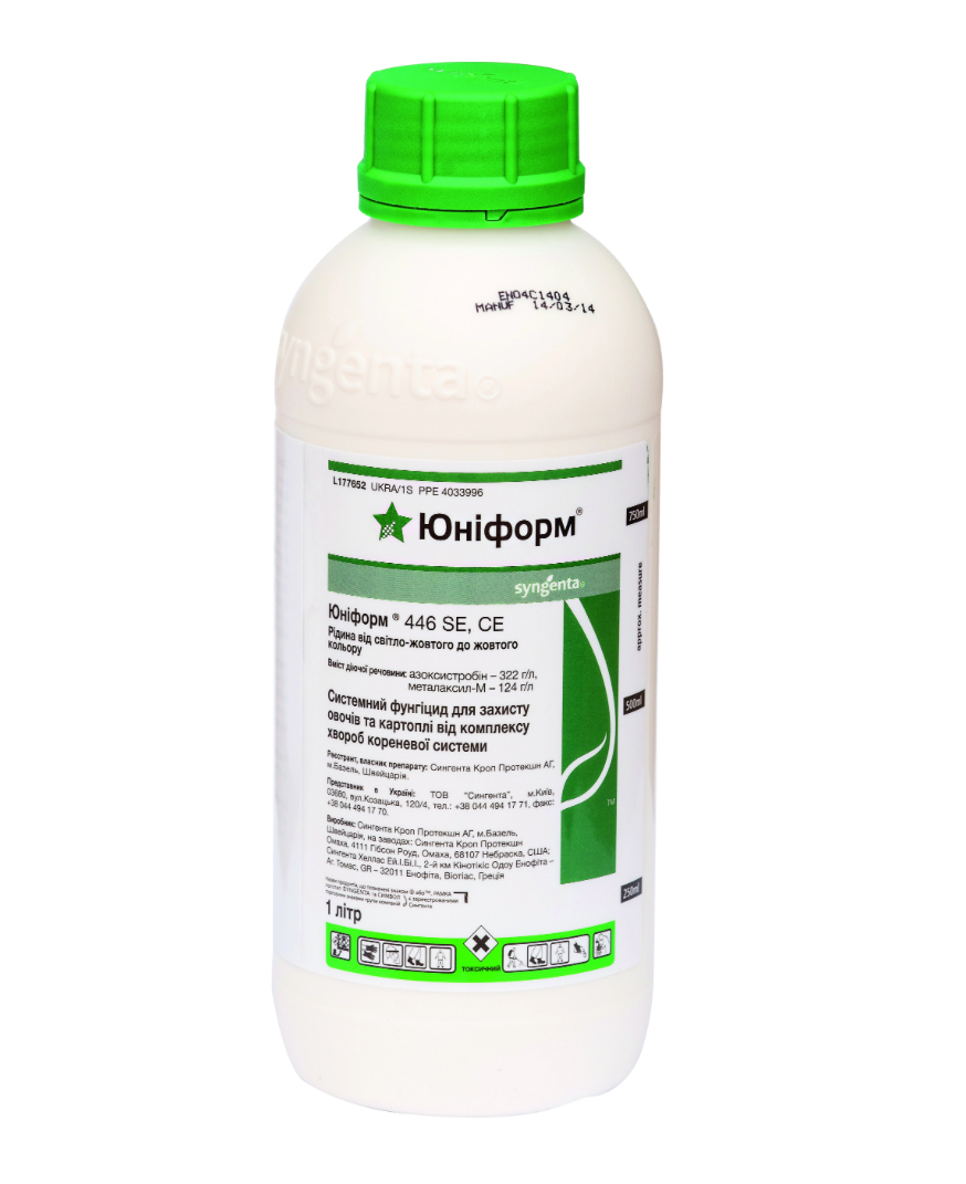 Юниформ® 446 SE, CE – высокоэффективный системный фунгицид от компании Syngenta, созданный для лечения и профилактики грибковых заболеваний овощных, бахчевых и других культур. Препарат оказывает мощный защитный и лечебный эффект, обеспечивая здоровый рост растений, сильную корневую систему и сохранение урожая.