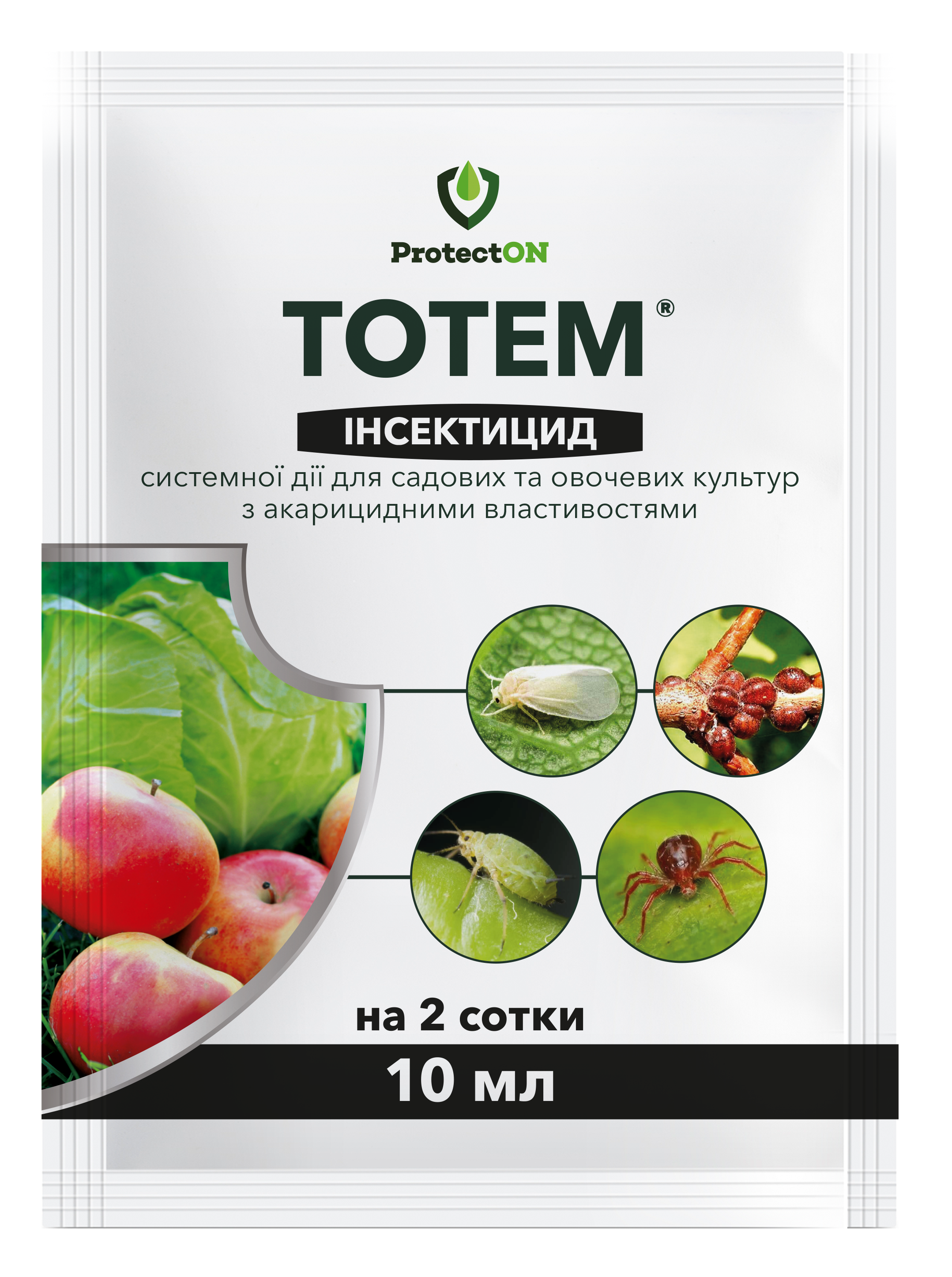 Тотем – высокоэффективный инсектицид системного и акарицидного действия от бренда ProtectON, предназначенный для надежной защиты садовых, овощных, плодово-ягодных и полевых культур от широкого спектра вредителей. Препарат действует как профилактически, так и лечебно, контролируя тлей, клещей, трипсов, щитовок, цикадок, белокрылка и других сосущих вредителей на всех стадиях развития.