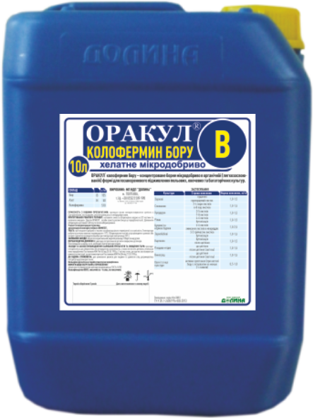 Оракул Колофермін Бору – концентроване хелатне борне мікродобрива в органічній (легкозасвоюваній) формі для позакореневого підживлення польових, овочевих та багаторічних культур. Препарат ефективно ліквідує дефіцит бору у рослинах. Не містить баластних добавок, тому не викликає опіків листя, що повністю засвоюється через листову поверхню рослин.